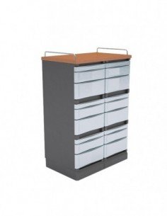 Sistema modular de guardado, construido en partes inyectadas de polietileno de alto impacto con color integrado en la mesa y disponible según catálogo. Cada módulo tiene capacidad de 2 a 6 cajones y posee visor plástico identificador por cajón. La opción de carpeta y bibliorato, permite encastrar en el cajón un gancho metálico con palanca de cierre y de perforación estándar, convirtiendo a este cajón en una carpeta de archivo